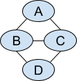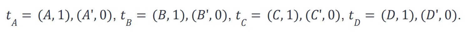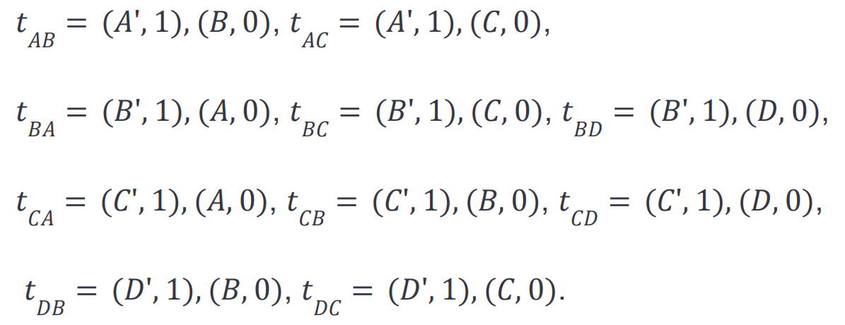 The longest path in the example is not unique. Many longest paths visit all nodes, such as A-B-C-D. We can construct with our gadget the following list of transactions for the vertices: