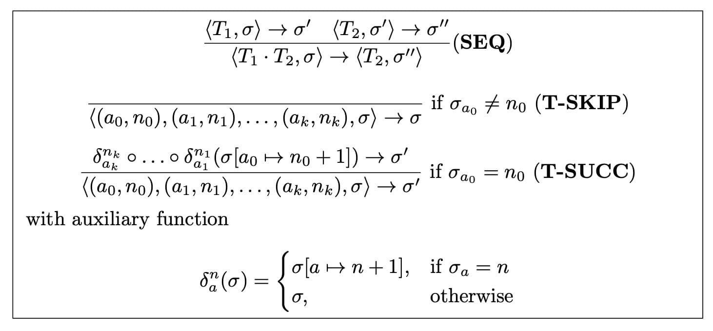 For people familiar with operational semantics, we can formalize the semantics for a given transaction list T = t₁ · t₂ ·...· tₙ and an account’s nonces as a mapping σ: 𝐴 → 𝑁 that maps addresses (from the set of addresses A) to nonces (i.e., natural numbers including zero). The inference rules are shown below.