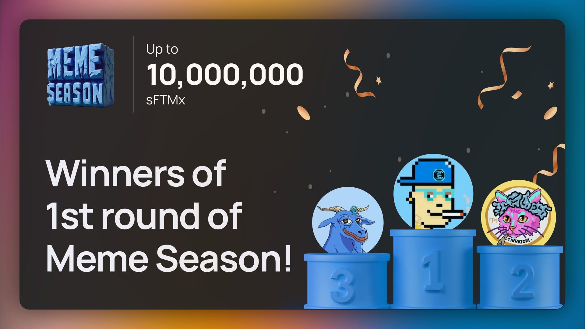 We announced the winners of Meme Season's 1st round! HOOPS won 600k sFTMx, THC won 300 sFTMx, and sGOAT won 100k sFTMx. 80% of the prize went to memecoin holders.