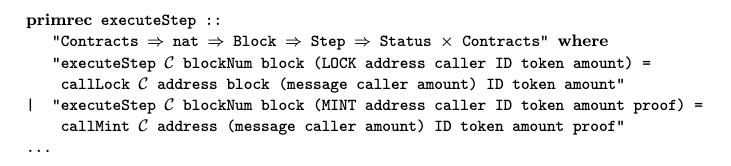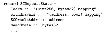As with many formal method specifications, we view the system as a transition system. We first specify the state of the contracts. For instance, we could define a record type for the state of SCdeposit and collate all the contracts as a mapping of address to contract state.