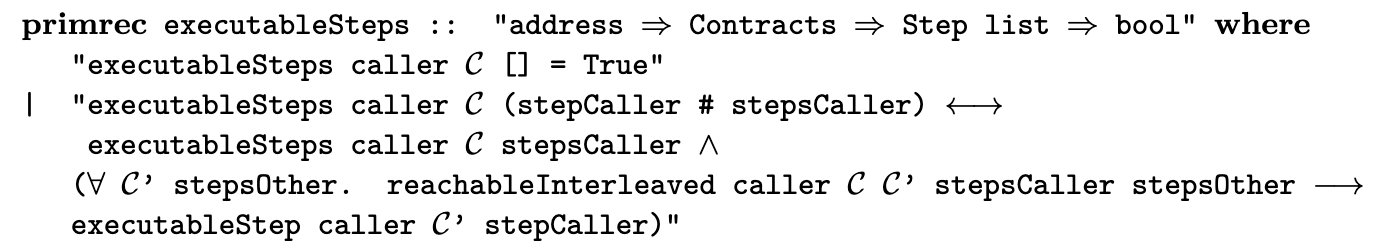 The predicate reachableInterleaved caller C C' stepsCaller stepsOther is defined inductively and checks whether the steps can be executed, regardless of the steps taken by other users.