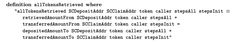 We define the properties we want to hold for the transition system. For instance, we always want an equilibrium between blockchain tokens: