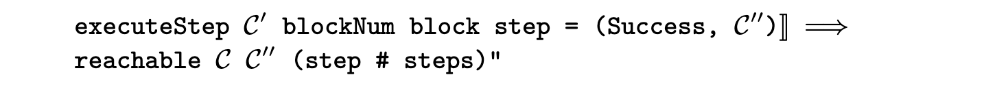 Reachability between blockchain states is defined inductively. Each state is reachable from itself. If C′ is reachable from C by a series of steps, and executing a step reaches C′′ from C′, then C′′ is reachable from C by the combined series of steps.
