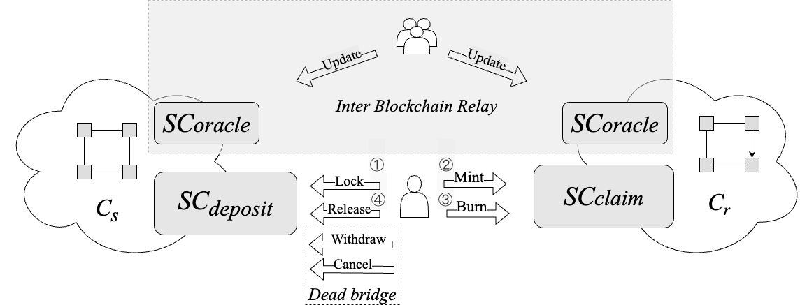 We assume that a special contract SCoracle keeps track of state root hashes and that a consensus of trusted users regularly updates the state root hashes by invoking Update transactions. When executing a Mint transaction, the contract SCclaim on Cr verifies that the Lock transaction took place on Cs at block height using the Merkle proof and state root hash of Cs read from SCoracle, which confirms that the log locks contain valid data about the Lock transaction.