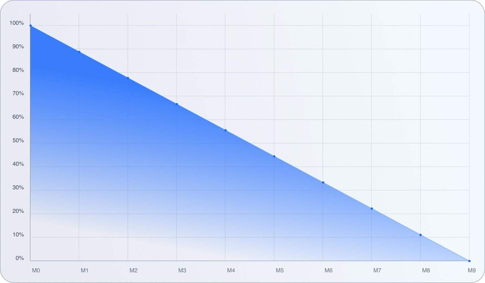 If a user decides to claim their vested tokens before their full maturation period, a portion of these tokens is burned. The burn rate decreases linearly over the 9 months. The earlier the claim, the higher the percentage of tokens burned.