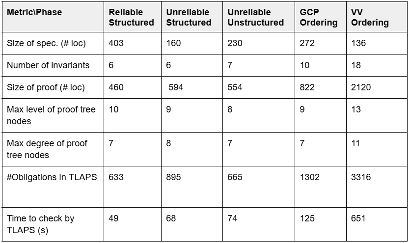 The effort required to understand, define, and validate the five protocols fully spanned approximately 14 person-months distributed among five team members. Formal proof performance was evaluated using TLA+ and TLAPS. Table 1 presents metrics detailing the scope of the DAG construction specifications and the ordering specifications.