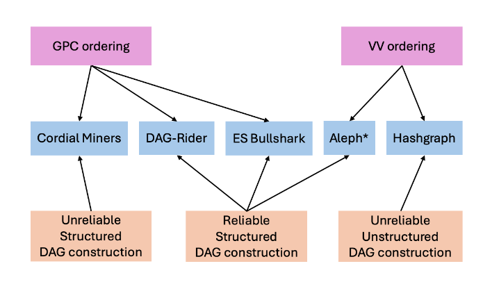 On the other hand, protocols that have a partial synchronous model do not require nondeterminism. Lastly, the structure of the DAG differs between protocols. Hashgraph, for example, unlike the other protocols, does not block in every round to receive 2f+1 nodes; however, it needs to compute special witness nodes to layer the DAG.