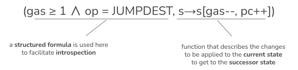 For example, a specification for a JUMPDEST state transition is expressed as follows: